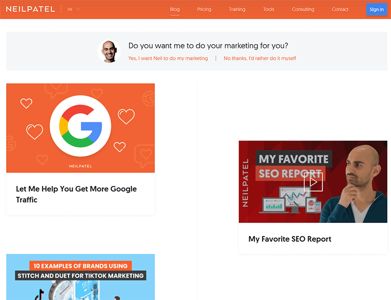 Neil Patel’s blog is, in itself, an excellent example of personality branding. Listed as one of the Top Ten Marketers by Forbes, Patel is a well-known influencer who uses his blog to draw new clients to his marketing company while offering helpful tips. Geared towards marketing firms building their websites from scratch, Patel’s marketing blog can be studied both as a tool to drive traffic to a marketing firm and a useful library of online marketing skills.