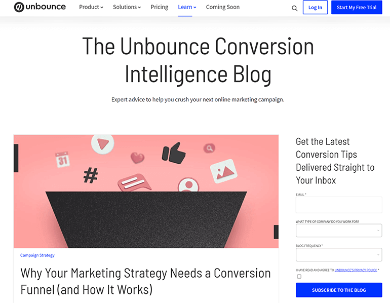 Unbounce’s marketing blog features tons of sharable infographics and skimmable bulleted lists, making it a great read for busy professionals. An expert in landing pages and conversions, Unbounce is expert at teaching its clients why and how it’s strategy works. Expect to see lots of vibrant examples and helpful templates here.