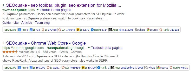 Una extensión básica que te permitirá analizar a tu competencia. Al instalarla y habilitarla, cada vez que entres a una web te aparecerá una barra midiendo distintos parámetros, aunque no solo eso, a partir de ahora, cada vez que busques en Google te aparecerá esta barra debajo de cada resultado de la SERP.Resultados de SeoQuake