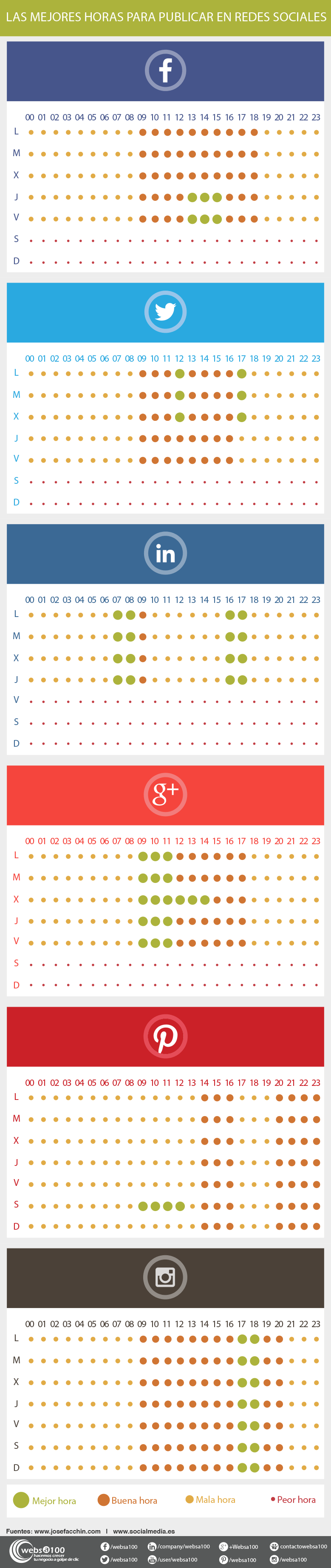 Pero como sabemos que empezar de cero es muy complicado, hemos creado esta infografía en la que os mostramos cuál es, en general, el mejor momento para publicar en las redes sociales más importantes. ¡Esperamos que os sea muy útil!