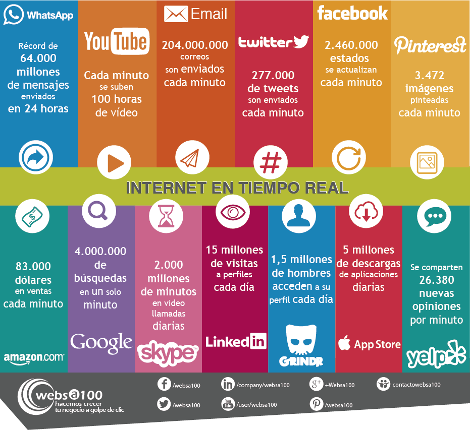 ¿Qué está ocurriendo en Internet en tiempo real? Mientras estás leyendo esta infografía en la red están ocurriendo multitud de cosas. Internet ha revolucionado la información y el acceso a la tecnología y nos ha interconectado a todos. ¿Acabas de mirar tu Whatsapp por un mensaje nuevo? La aplicación ha batido el record de 64.000 millones de mensajes en menos de 24 horas, a la vez que se enviaban 277.000 tweets por minuto y se realizaban 4.000.000 de búsquedas en Google. ¿Y tú, que haces ahora en Internet? ¿Has actualizado tu perfil de Facebook o te acabas de descargar la última aplicación de moda en la App Store? Como agencia de marketing digital te contamos todo lo que ocurre en Internet en tiempo real en la siguiente infografía.