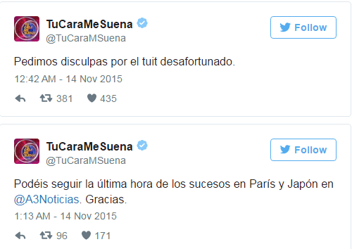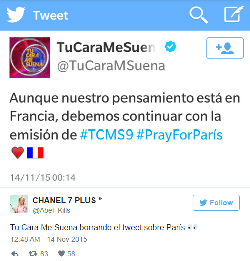 El único que informaba entonces era el canal noticias 24 horas de televisión española. Para colmo de los males, la cuenta de Twitter de ‘Tu Cara Me Suena’ publicó un inapropiado tweet que decía: “Aunque nuestro pensamiento está en Francia, debemos continuar con la emisión de #TCMS9 #PrayForParis”. Rápidamente las redes sociales se llenaron de críticas e insultos al programa.