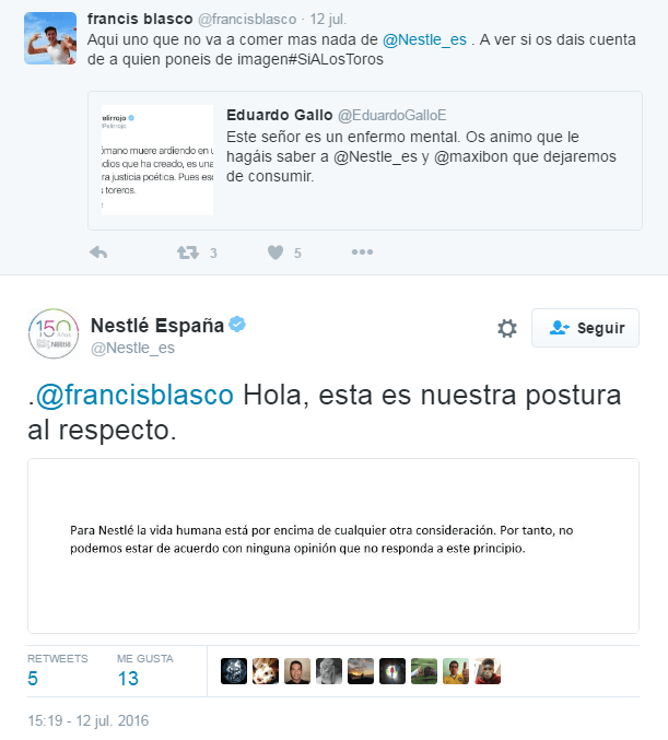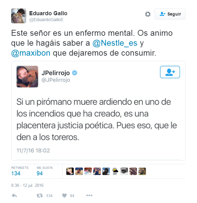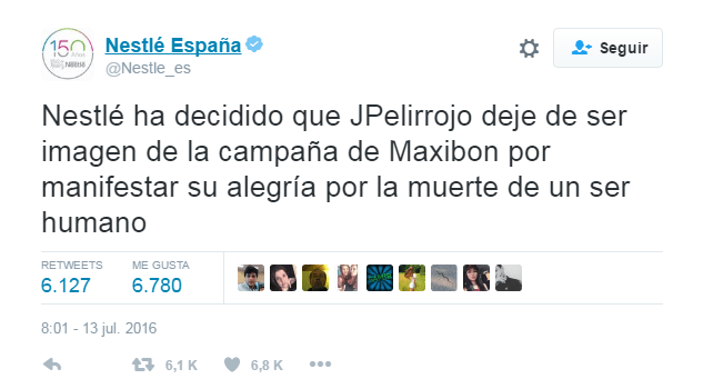 Si algún trabajador de nuestro equipo hace algo que perjudique la imagen de la empresa puede llegar a provocar una verdadera crisis de reputación online por la rapidez de las redes sociales. Por lo que hay que tenerlas monitorizadas y vigiladas para cuidar la comunicación. Este verano Nestle tuvo que hacer frente justo a eso mismo de lo que estamos hablando. Ellos tenían un contrato en términos publicitarios con el youtuber JPelirrojo, y él mismo soltó en redes unos comentarios en los que mostraba su postura acerca de la muerte del torero Víctor Barrio. Muchos usuarios se quejaron directamente a Nestlé quien tenía contrato con él al ser la imagen de los helados Maxibon.