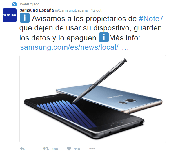 En la cuenta de Twitter de Samsung España están manteniendo de forma fija un Tweet en el que indican paso a paso qué procedimientos seguir para la devolución de sus defectuosos Galaxy Note 7. Solo el tiempo dirá si Samsung es capaz de recuperar la confianza de sus clientes. Recordemos que la confianza se basa en la credibilidad , la experiencia y la capacidad técnica; y las dos últimas no sirven sin la primera. Seguro que todos tendremos la vista fija en las baterías de Samsung la próxima vez que compremos un móvil. Es una oportunidad perfecta para que mejoren sus baterías y salgan reforzados.