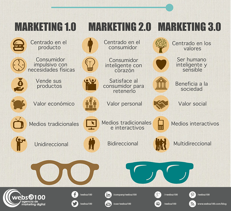El marketing que conocemos hoy dista de aquel que se originó en la década de los cincuenta. Ha ido evolucionando a la par que los consumidores mientras se daba cuenta de que el verdadero núcleo se encontraba en éstos. Cuando todo era más sencillo, la única preocupación de las empresas era vender lo que producían centrándose en los deseos y necesidades del consumidor y convirtiendo al producto en protagonista absoluto. Pero los años pasaban y este consumidor ocupaba cada vez más espacio en el centro del escenario, y no era tan fácil llegar a él y convencerle de que nuestro producto era el mejor. El consumidor estaba cada vez más informado, por lo que se le añadió una dimensión emocional al marketing y se pasó así al marketing 2.0. Pero esta dimensión emocional también está empezando a agotar a estos consumidores, que hartos de tanto chantaje emocional por parte de las empresas buscan un nuevo motivo de peso para consumir según qué marcas. Y ese motivo lo encontramos en el Marketing 3.0.