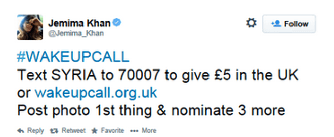 La receta del éxito es simple: redes sociales, famosos influyentes y compromiso social. La periodista Jemina Khan, embajadora de Unicef para Reino Unido y ex novia de Hugh Grant, debió llegar a la misma conclusión y por eso decidió emprender una nueva campaña viral, esta vez con la intención de ayudar a los niños refugiados de Siria. El nombre de la campaña es Wake Up Call, cuya traducción sería “llamada a despertar”, un juego de palabras que nos invita a la acción consiguiendo no solo que nos despertemos nosotros sino también nuestras conciencias. El desafío consiste en sacarse una selfie recién levantado y donar, mediante un mensaje de texto, 5 libras a Unicef.