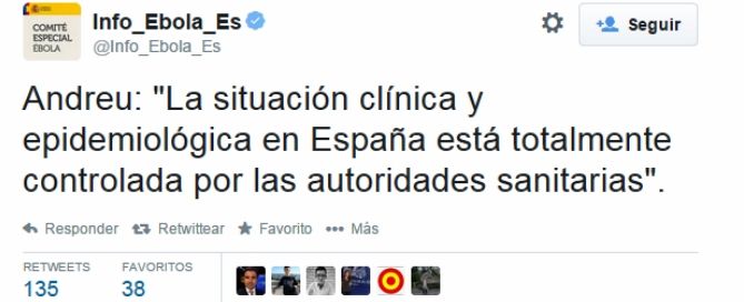 Mientras, el Comité especial para la gestión del ébola se constituía e informaba públicamente. El 14 de octubre, el Gobierno crea una cuenta de información específica en Twitter en torno a la enfermedad: @Info_Ebola_Es y una semana después de que fuese ingresada Teresa se anuncia que: "La situación clínica y epidemiológica en España está totalmente controlada por las autoridades sanitarias". Esta cuenta no responde a ninguna consulta por parte del ciudadano y tan sólo se limita a informar mediante tuits “oficiales” por lo que cae en un nuevo error, la ausencia de comunicación directa con la ciudadanía.